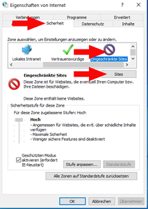 Im nächsten Fenster klickt ihr auf Sicherheit und dann ganz rechts auf Eingeschränkte Sites. Anschließend auf Sites.